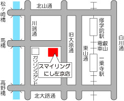スマイリングにし左京店 アクセスマップ 公共機関でご来店の方は、 バス:「高野泉町バス停」より徒歩2分!! 地下鉄:「松ヶ崎駅」より徒歩8分!! 叡山電鉄:「修学院駅」より徒歩8分!! お車のご来店の方は、 駐車場ございます。 大きな地図で見る